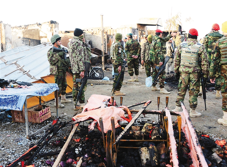 12月9日,阿富汗士兵聚集在坎大哈机场的遇袭现场。据阿富汗一名安全官员9日透露,塔利班武装8日晚间袭击了位于阿富汗南部坎大哈省首府的坎大哈机场,已造成至少37名平民死亡、18人受伤,另有9名武装分子和8名军警在交火中身亡。 新华社/法新