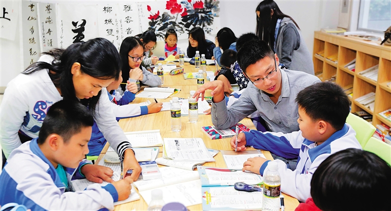 12月9日下午四点半后,在海口市美兰区海甸街道新安社区服务中心的“四点半学堂”十分热闹,新安乐助社工及海大志愿者们对该社区放学后的孩子进行一对一辅导,直到父母亲下班回来接孩子。