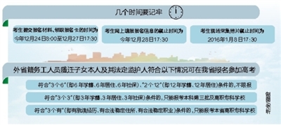 据了解,本省户籍考生、外省籍务工人员随迁子女在我省参加高考的报名条件和去年一致,其中外省籍务工人员随迁子女本人及其法定监护人符合以下情况可以在我省报名参加高考:符合“3个6”(即6年学籍、6年居住、6年社保)、“2个12”(即12年学籍、12年居住)条件的,不限报;符合“3个3”(即3年学籍、3年居住、3年社保)条件的,只能报考本科第三批及高职专科学校;符合“3个有”(即有就读经历、有合法稳定住所、有合法稳定职业)条件的,只能报考本省高职专科学校。