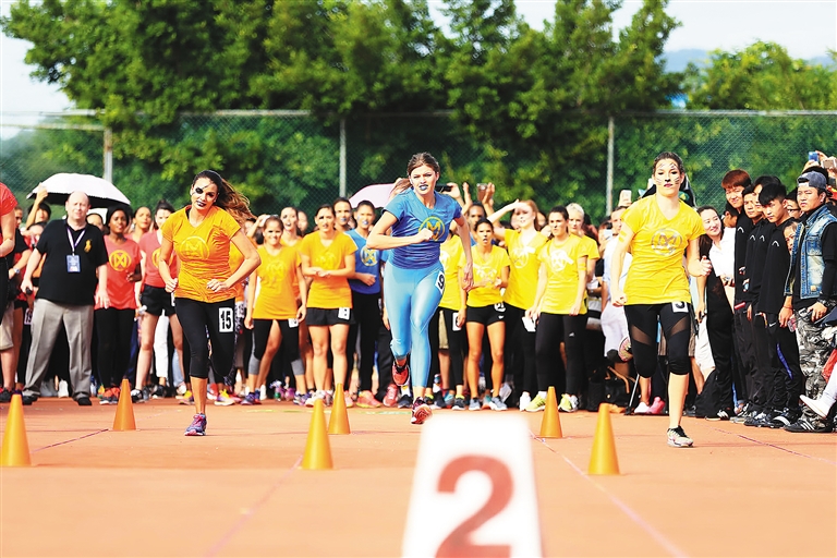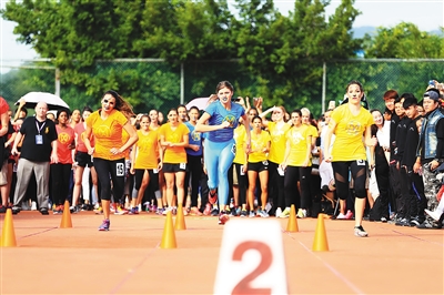 在运动场上,24名世姐赛选手们分为橙、蓝、红、黄4队,她们脸上带着猫型图案,大步如流星奋力奔跑,围观的选手们互相拉歌,为自己的队友加油,甚至有世姐选手以肩扛起另一名选手高声拉歌,让围观群众见识到了这群美丽姑娘女汉子的一面。25米折返跑、100米短跑……田径道上选手们展现出了舞台上少见的英姿,总积分获得第一名的选手将直接进入世姐总决赛15强。
