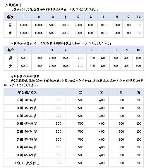 运动不分年龄,特设中国唯一“9个年龄段奖金”,以《马拉松段位标准》的年龄组为准,分男女各9个年龄组,18岁-34岁为第一段,35岁-70岁以上每5岁一段,各组取前五名,让更多的业余选手获奖,最大众的马拉松才是真正的马拉松!