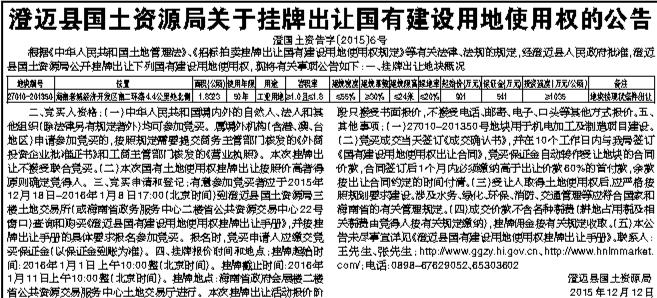 澄迈县国土资源局关于挂牌出让国有建设用地使用权的公告