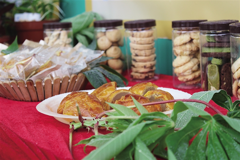 首届“热博会”上,用木薯、辣木分别制成的形式多样的零食点心,让 “吃货们”大快朵颐。