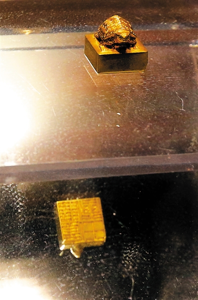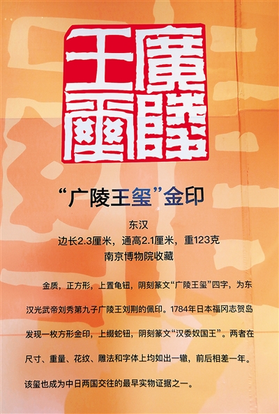值得一提的是,在文物精品展中展出的“广陵王玺”金印,现已考证为东汉光武帝刘秀第九子——广陵王刘荆之物。金质的正方形佩印上置龟钮,阴刻篆文“广陵王玺”四字。