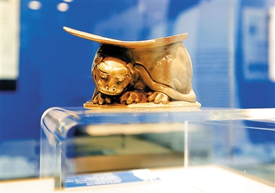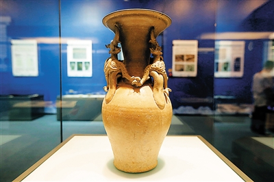 展览展出的越窑青瓷摩羯纹虎枕便可对此进行佐证——其摩羯造型起源于古代印度人对海洋大鱼的神化,一般认为是随佛教东传而进入中国。在这尊瓷枕平滑的枕面上,摩羯纹附势而刻,一虎双头工艺精细,就是工匠在受到异域文化熏陶之后的成果。