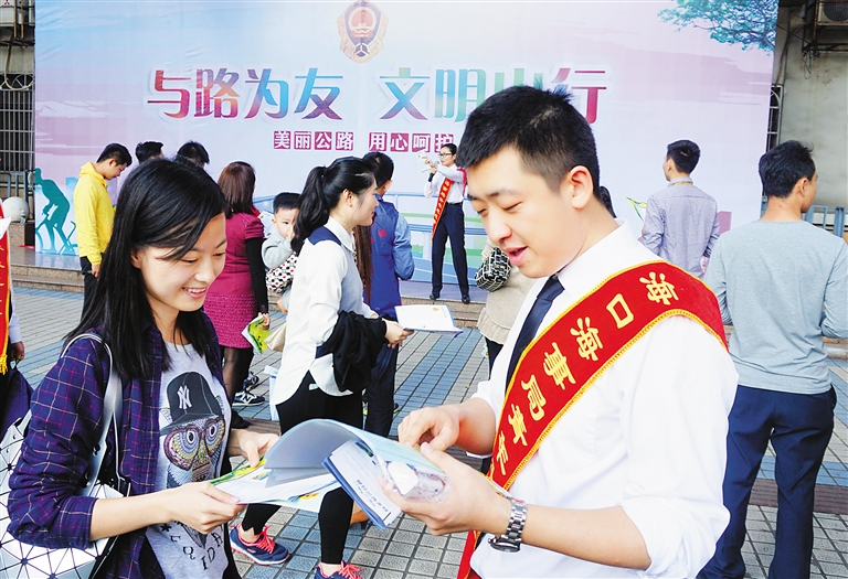 12月12日,在海口市大同路,参加“与路为友,文明出行”志愿服务宣传活动的志愿者在给行人发放文明出行宣传单。志愿者们通过多种形式向市民宣传文明安全出行知识。本报记者 张茂 通讯员 陈菁华 摄