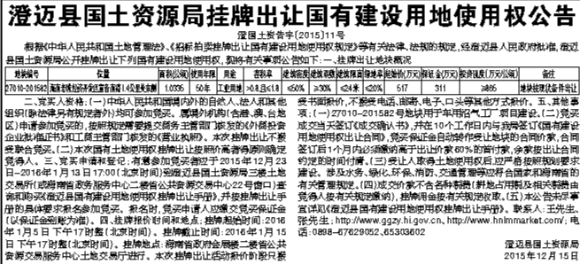 澄迈县国土资源局挂牌出让国有建设用地使用权公告