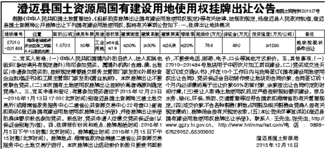 澄迈县国土资源局关于挂牌出让国有建设用地使用权的公告