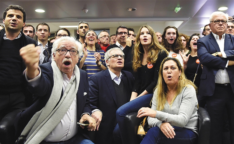 12月13日,法国社会党的支持者在首都巴黎听取选举初步计票结果。 法国内政部13日公布的初步计票结果显示,在当天举行的法国大区选举第二轮投票中,主张排外、反移民、反对申根协定的极右翼政党国民阵线未能在任何一个大区获胜,也因此未能获得担任大区议会主席的资格。 新华社/法新