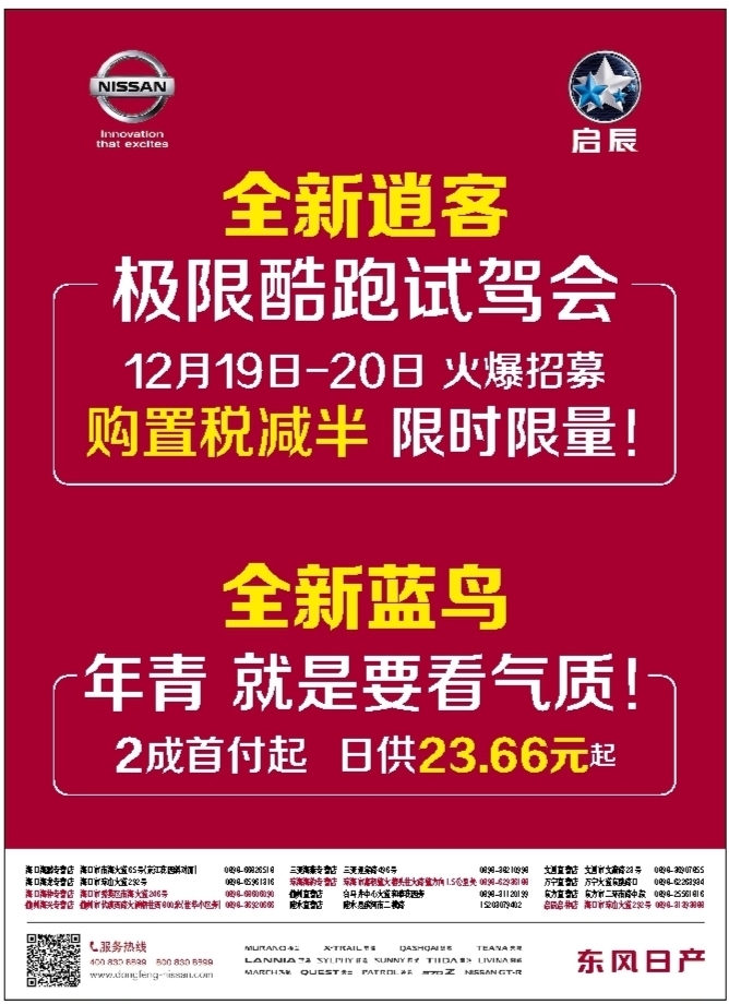 全新逍客专业SUV底盘,四轮独立悬挂,买SUV就是要买四轮独立悬挂!全新逍客年末冲量可享购置税减半,详询海南东风日产各个专营店。