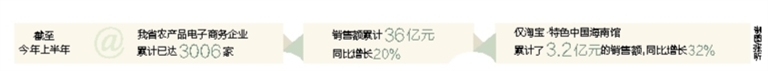 截至今年上半年,我省农产品电子商务企业累计已达3006家,累计销售额36亿元,同比增长20%,仅淘宝·特色中国海南馆累计了3.2亿元的销售额,同比增长32%。