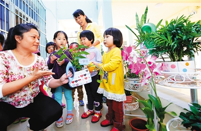 近日,在海南大学附属幼儿园小(一)班的“农家小院”里,地瓜、土豆、大蒜都已经发芽了,老师们正带领小朋友们观察植物和小动物的生长。据介绍,该“农家小院”的花盆大多是小朋友和家长们变废为宝,用家里的废旧洗衣液瓶子和矿泉水瓶子改装而成的,旨在培养小朋友们节约资源、保护环境的意识和观察事物的能力。