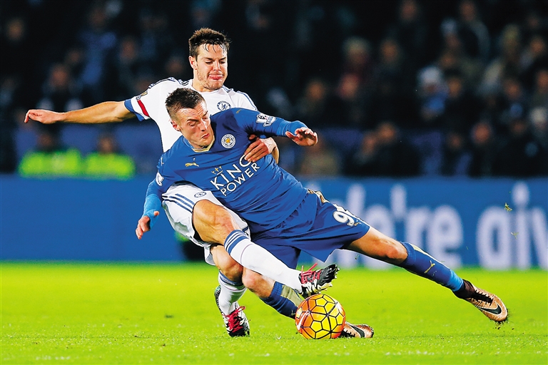 12月15日,在英超第16轮比赛中,莱斯特城队主场2:1战胜切尔西队,登上积分榜首。图为切尔西队球员阿斯皮利奎塔(左)与莱斯特城队球员瓦尔迪在比赛中争抢。新华社发