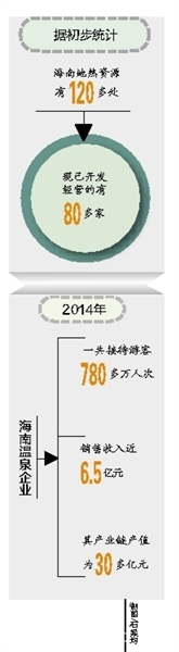 省温泉旅游协会会长张永康介绍,“温泉旅游”是以温泉为载体,以沐浴、泡汤和健康理疗为主要方式,以体验温泉、感悟温泉文化为主题,达到休闲、疗养及度假目的的旅游活动。据初步统计,海南地热资源有120多处,现已开发经营的有80多家。2014年海南温泉企业一共接待游客780多万人次,销售收入近6.5亿元,其产业链产值为30多亿元。