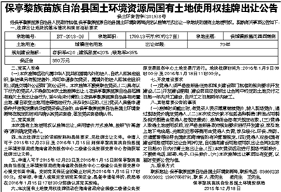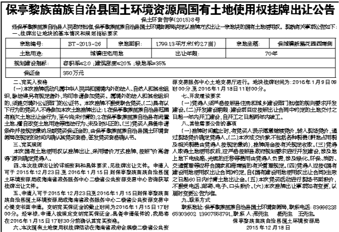 保亭黎族苗族自治县国土环境资源局国有土地使用权挂牌出让公告