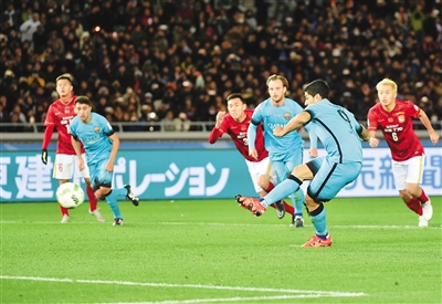 3:0 第66分钟,阿尔维斯分球禁区,穆尼尔在黄博文干扰下顺势倒地,主裁判判罚点球,苏亚雷斯操刀命中,上演帽子戏法。