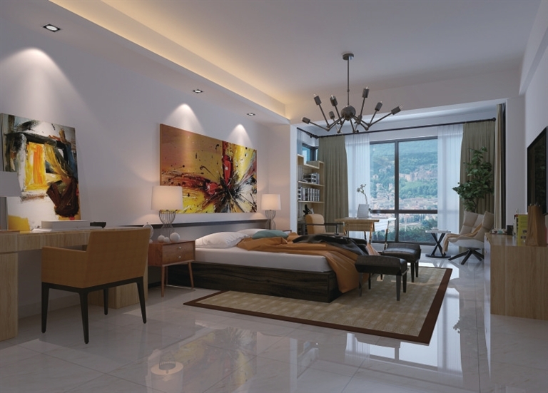 设计说明:以黑白时尚配色为主,雅致饰品随性摆设,线与面的处理、灯光冷暖的搭配十分协调。主卧室随意的水彩,烘托出温馨暖意,巧妙地把书房和卧室的功能合二为一,将原本单调的卧室转变成具有阅读、书写、休息多功能的场所。