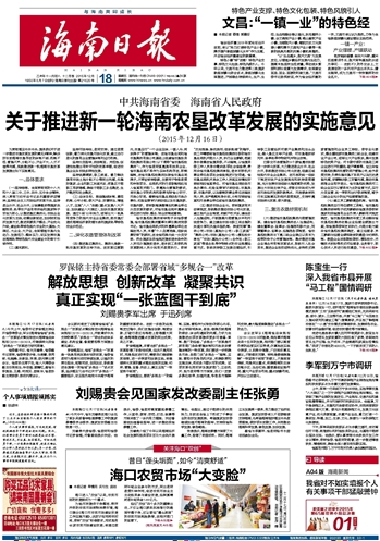 海南日报 头版 001 2015-12-181 2015年12月18日 星期五
