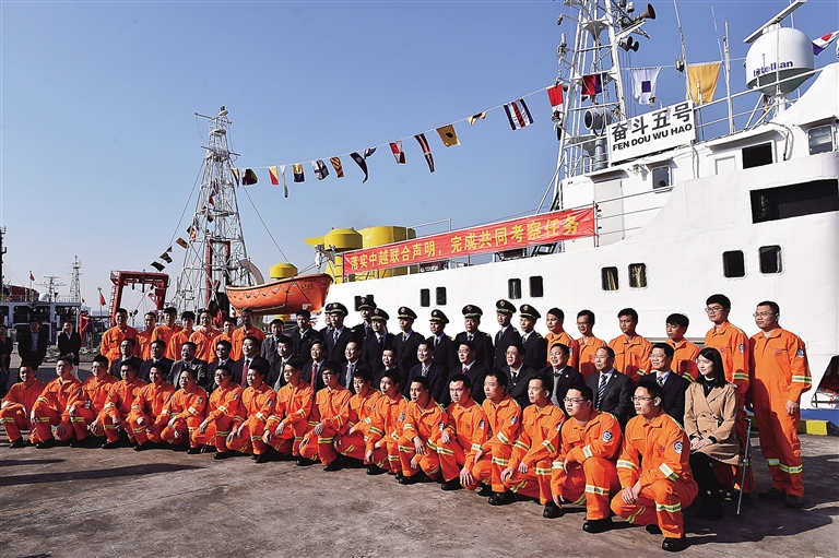 12月19日,中越双方代表以及考察队员在启动仪式上合影。 当日,中越北部湾湾口外海域共同考察启航仪式在广州举行。 新华社发