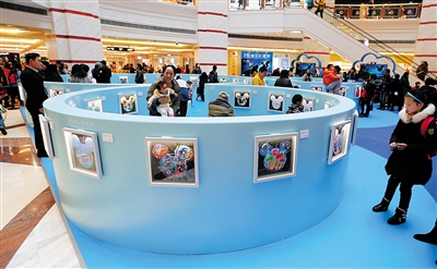 12月19日,市民们在参观展览。 当日,一个献给孩子们的“迪士尼视界”1.2米艺术展在上海环球港举行。本次展览布展墙的高度仅为1.2米,旨在激发孩子们的艺术天性,同时邀请所有大人蹲下来,和孩子们一起观展,让家长和孩子平等友好相处,共度美好时光。 新华社记者 凡军 摄