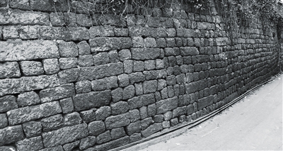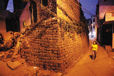 按照黄培平提供的线索,记者顺着忠介路拐进草芽巷进行了探访,果然发现这里还有一段老城墙。这是一段十多米长的残存砖墙,墙的南面及西面遍布着商铺,古老的石砖上被涂了厚厚一层石灰,杂乱的野草从城墙的石头缝里钻出。黄培平说:“那些都是老城墙的墙基,作为盖房子的地基不错,于是此前就有很多居民就在上面盖房子,原先还有人在上面盖过五六层的高楼,现如今都被拆掉了。”