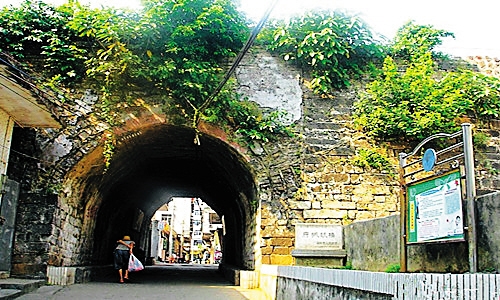 府城如今残存的其中一处古城墙遗址位于东门里。东门里,顾名思义,就是原先东门的老城墙。穿过一条熙熙攘攘的菜市场向美舍河方向走去,就能见到一处两边由黑色砖块砌成的宽约3米的巷道,让通往美舍桥的道路陡然变窄,巷子不深,但不到十米的距离,就走到了头。