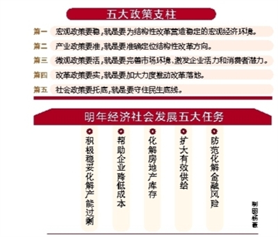 会议强调,明年及今后一个时期,要在适度扩大总需求的同时,着力加强供给侧结构性改革,实施相互配合的五大政策支柱。第一,宏观政策要稳,就是要为结构性改革营造稳定的宏观经济环境。积极的财政政策要加大力度,实行减税政策,阶段性提高财政赤字率,在适当增加必要的财政支出和政府投资的同时,主要用于弥补降税带来的财政减收,保障政府应该承担的支出责任。稳健的货币政策要灵活适度,为结构性改革营造适宜的货币金融环境,降低融资成本,