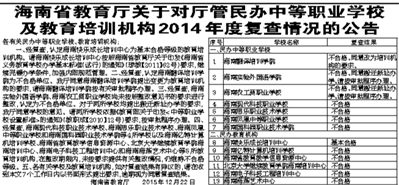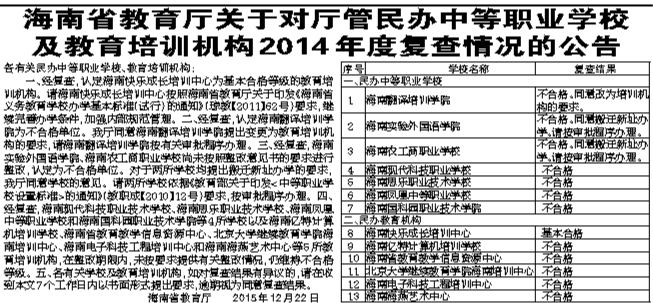 海南省教育厅关于对厅管民办中等职业学校及教育培训机构2014年度复查情况的公告