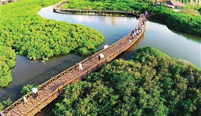 团团簇簇的红树林,一半在水中,一半在水面以上,远远看去,仿佛“漂浮”在湿地上。其中错落有致、各具特色的精致住宅更是使人心生探赏之欲。“很多朋友都推荐了这个景点,这次带着儿子来‘探秘’啦!”海口市民林琳带着儿子钻进了红树林栈道,在茂盛的树荫底下穿行,外头的喧嚣被树林隔绝在外,唯有沼泽里的鱼儿翻身不时发出“咕噜咕噜”的气泡声,打破了这片树林里的静谧。