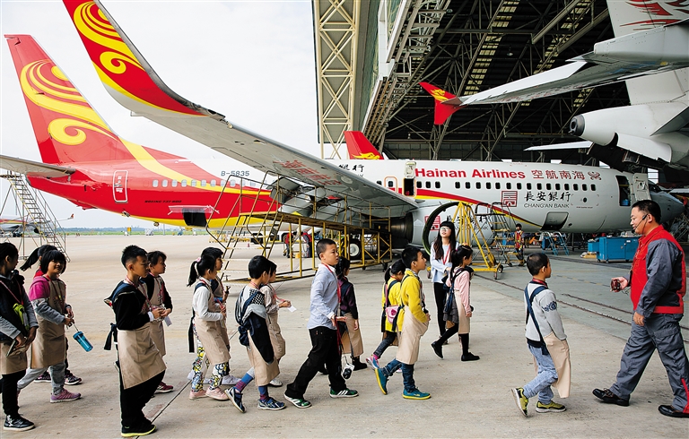 在海航技术志愿者和海口彩翼儿童美术机构老师的带领下,30多名小航空迷来到海航机务维修技能训练中心和飞机维修机库,实地参观飞机维修工作现场。