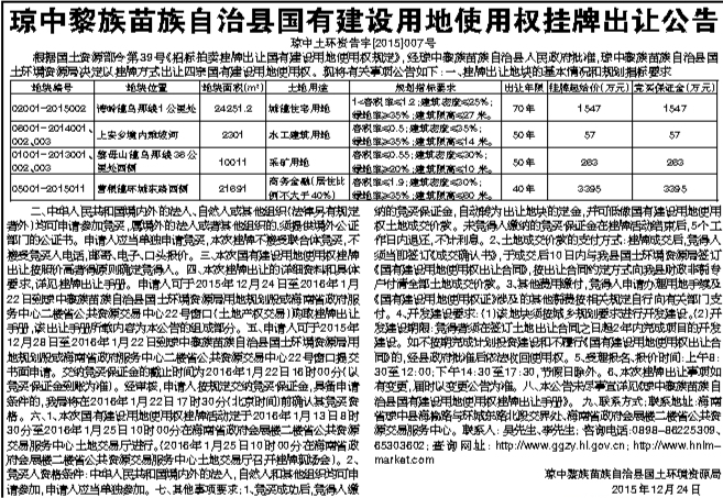 琼中黎族苗族自治县国有建设用地使用权挂牌出让公告