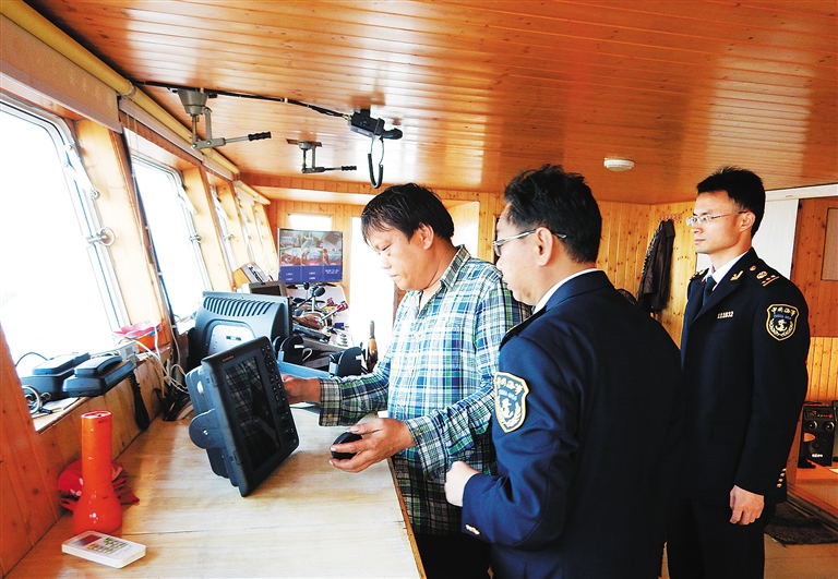 12月22日,海口海事局执法人员对市民举报的海口市新埠岛南渡江入海口处存在内河船非法采砂现象进行拉网式排查和查处。图为海事执法人员登船检查。据介绍,近一段时期以来,为严厉打击辖区水上非法采砂行为,海口海事局前期对砂石运输船舶实行“一船一报告、一船一档案、一船一动态、一船一跟踪、一船一核查”的工作机制,辖区内砂石运输船舶违法行为得到有效遏制。本报记者 宋国强 摄