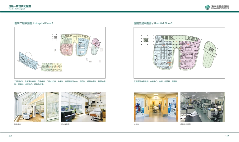 医院二层设ICU、血液净化病房、日间病房、门诊办公室、中医科、宫颈癌防治中心、理疗科、妇科肿瘤科、腹部肿瘤科、疼痛科、会议中心、行政办公室。