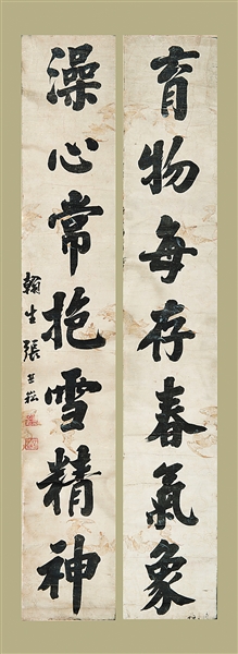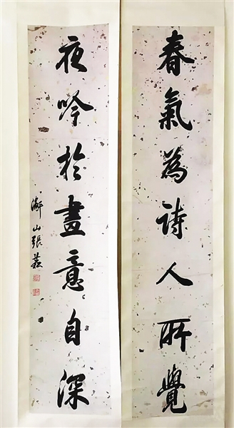 经海南文博专家张建平先生鉴定为真迹无疑。可惜上联题款被挖补,依稀可以看到某某兄嘱。从作者落款看岳崧两字连写,为张岳崧六十以后作书习惯,纸张为上好的洒金宣纸,字体欧骨颜面,笔墨酣畅,运笔丰润有力,浑厚庄重,势雄意健。可谓是人书俱老,是张的书法精品。张被誉为清代广东四大家和海南书绝,名实相符。