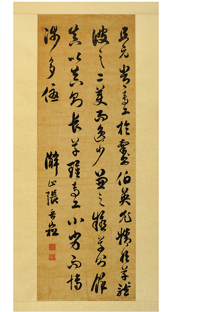 省博物馆收藏的张岳崧行书轴这次被国家文物鉴定委员会专家定为国家一级文物。该藏品1987年由广东省文管办拨交给琼海市博物馆,后于2008年4月调拨至省博物馆。书轴质地为纸本水墨,纵118厘米,横40厘米,书录唐孙过庭《书谱》43字,内容为“且元常专工于隶书,伯英尤精草体,彼之二美而逸少兼之。拟草则馀真,比真则长草,虽专工小劣而博涉多优”。张岳崧字澥山,自题“澥山张岳崧”,钤白文“张岳崧印”、“秦陇持衡”。