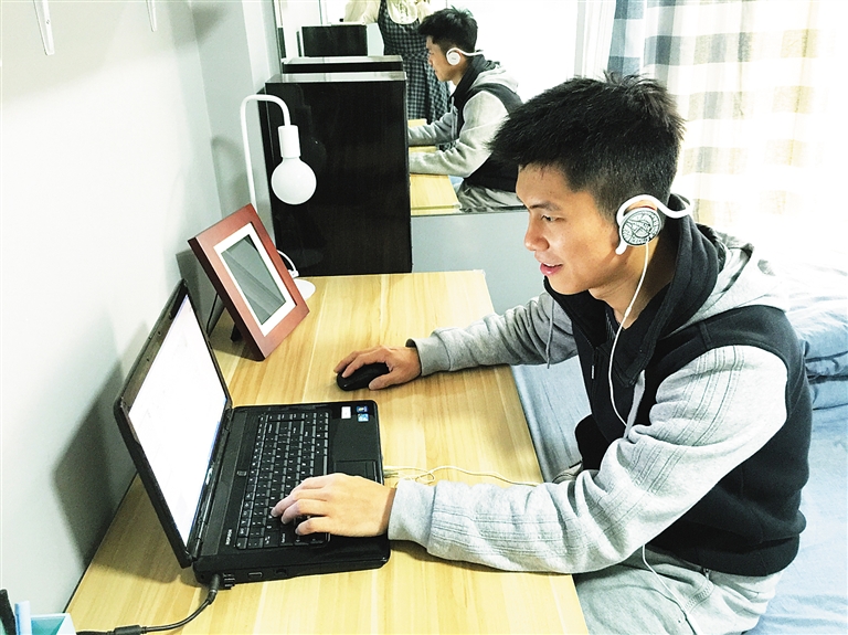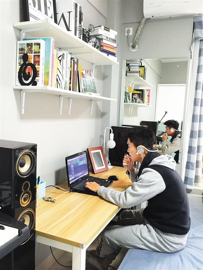 澄迈金江镇的一个小区里,暖暖的阳光透过落地窗,洒在了以灰、黑、白三种色调构成的一间小小的卧室里。这就是王泽恺的“工作室”,一如他带给人的第一感觉,简单、干净、有品位。打开电脑,插上耳机和麦克风,点击开软件,专注地配合着画面上的人物口形和动作,时而低沉、时而高扬、时而诙谐,屏幕上声音曲线波浪起伏,按照网友的“点单”,王泽恺正着手制作一段新的澄迈话版的配音视频。