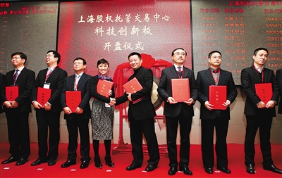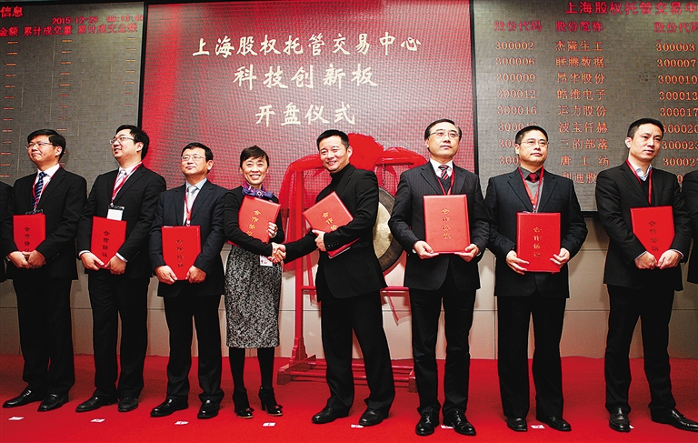 12月28日,“科创板”上市企业代表与合作银行代表在开盘仪式上互换合作协议。当日,上海股权托管交易中心(简称“上海股交中心”)设立的科技创新企业股份转让系统(简称“科创板”)正式开盘,首批27家企业成功挂牌,其中科技型企业21家,创新型企业6家,平均股本1944万元,2014年的平均营业收入2272万元,70%的企业实现盈利。 新华社记者 方喆 摄