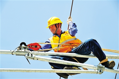 ③2015年7月3日下午3时,中铁电气化集团海南项目部施工人员正在安装调试电力接触网,当天气温39℃。