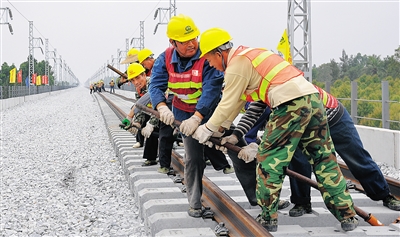 ②2015年2月19日上午,环岛高铁儋州段工人们正在铺轨。