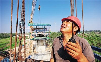 ①2014年10月22日,环岛高铁澄迈金江段,建设者在施工现场。