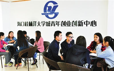 12月28日,我省首个专门为青年学生创业创新提供全方位服务的创业创新中心在海口桂林洋大学城挂牌运作。目前已有电子商务、网络科技以及海南的热带水果网络营销等十多家由青年学生自主创办或领军的企业进驻中心。图为几名青年学生正在研讨新科技产品的推广应用问题。本报记者 古月 摄