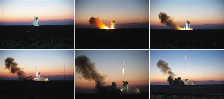 12月17日8时12分,我国在酒泉卫星发射中心用长征二号丁运载火箭成功将名为“悟空”的暗物质粒子探测卫星送入太空。图为火箭发射全过程(由左至右,由上至下;拼版照片)。 “悟空”是目前世界上观测能段范围最宽、能量分辨率最优的暗物质粒子探测卫星,超过国际上所有同类探测器。它将在太空中开展高能电子及高能伽马射线探测任务,探寻暗物质存在的证据,研究暗物质特性与空间分布规律。 新华社记者 金立旺 摄 |