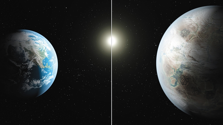 这张美国航天局7月23日公布的效果图显示的是地球(左)和太阳系外行星开普勒-452b。 美国航天局7月23日在音频新闻发布会上宣布,天文学家通过开普勒太空望远镜确认在宜居带发现第一颗与地球大小相似、围绕类似太阳的恒星运行的太阳系外行星——开普勒-452b。 新华社发 |