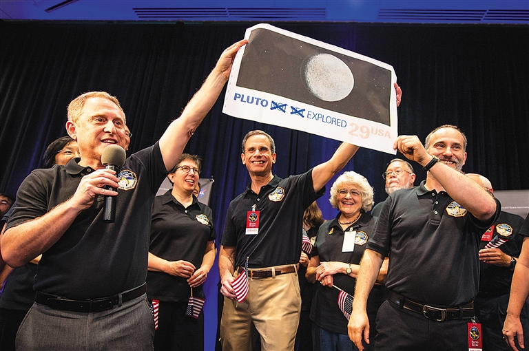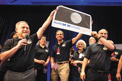 这是7月14日,在位于美国马里兰州的约翰斯·霍普金斯大学应用物理实验室,“新视野”号探测器传回冥王星照片后,美国航天局“新视野”号项目负责科学家艾伦·斯特恩(左)与同伴在庆祝活动上举起标有“冥王星尚未被探测”字样的旧邮票放大图片。其中的“尚未”字样被划掉。 美国“新视野”号探测器于美国东部时间7月14日7时49分(北京时间19时49分)近距离飞过冥王星,成为首个探测这颗遥远矮行星的人类探测器。“新视野”号探测器于2006年1月升空,经过9年多长途跋涉,终于与冥王星“会面”。由于冥王星从未被来自地球的探测器近距离造访过,“新视野”号“看”到的一切都将被记录下来。此后,这个探测器还将继续前行,进入太阳系边缘神秘的柯伊伯带,这里可能隐藏着数以千计的冰冻岩石小天体。
