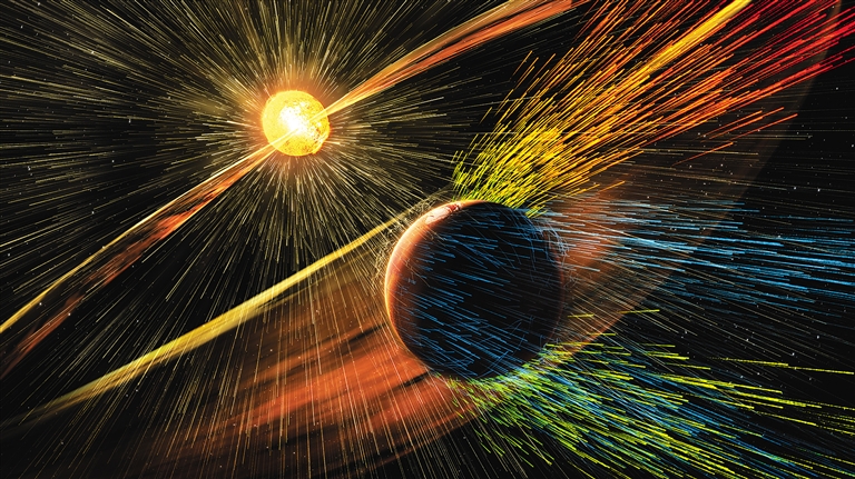 | 这是美国航天局11月5日公布的太阳风加速火星大气中被称为离子的带电原子,令其逃逸至太空中的示意图。 美国航天局11月5日公布的火星大气观测结果显示,太阳风可能是剥夺火星大气的罪魁祸首,导致这颗红色星球从像地球那样温暖、湿润的行星变成一个干燥、寒冷的沙漠世界。 新华社/美联 |