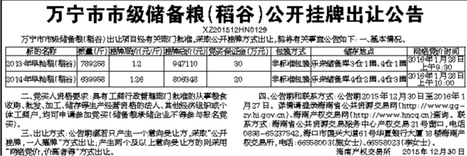 万宁市市级储备粮(稻谷)公开挂牌出让公告