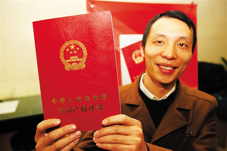 12月28日,宁波市民任先生展示刚刚领到的宁波市首本不动产权证书。 当日,浙江省宁波市不动产统一登记颁证工作在宁波市行政服务中心的不动产业务大厅正式启动,第一本不动产权证书正式颁发。 新华社发(张培坚 摄)