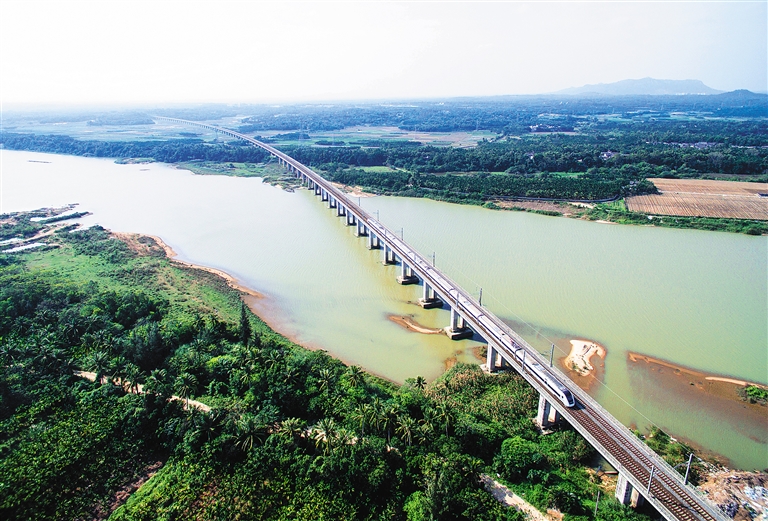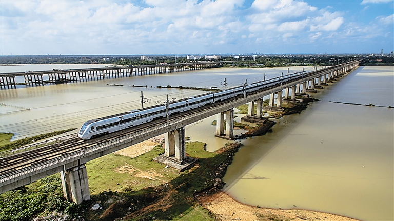 海南环岛高铁全长653公里,是全球首条环岛高铁;环岛高铁将海南岛南北两端的海口美兰、三亚凤凰两个国际机场串联在一起,实现空铁无缝对接,这在国内是首例。