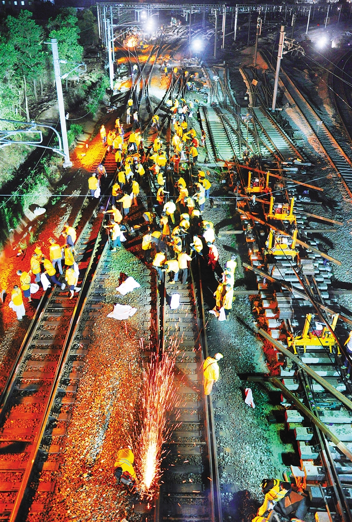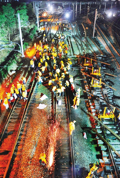 ⑤2015年5月,5000多名铁路工人夜战西环。 本报记者 古月 通讯员 叶坚 摄