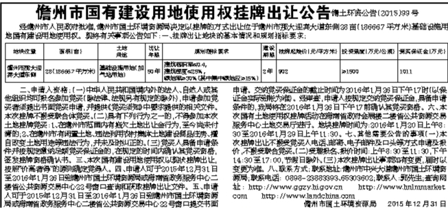 儋州市国有建设用地使用权挂牌出让公告儋土环资公告
